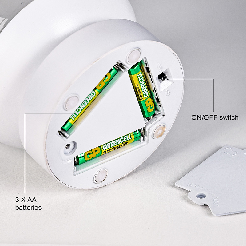 Нет необходимости в подключении; он может питаться всего от 3 батареек типа ААА, что обеспечивает простую установку и гибкое использование. На тумбочке, на столе, в детской кроватке или в походе.