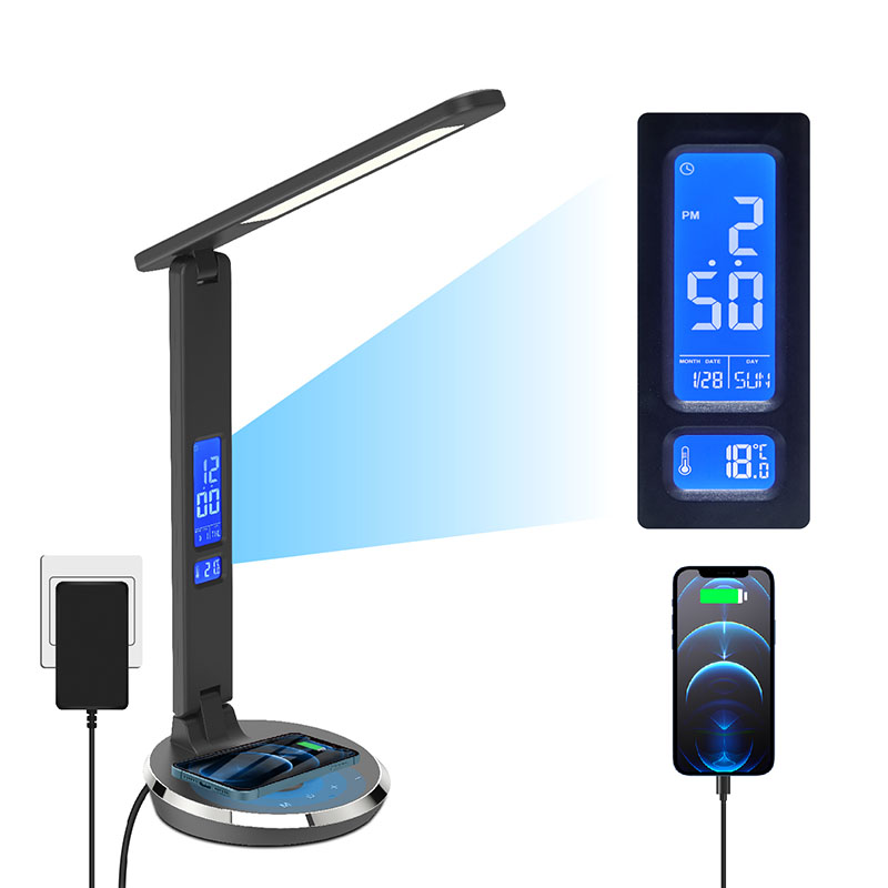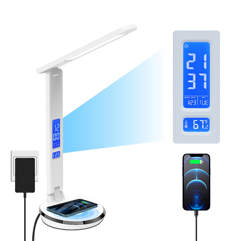 Имеется ЖК-экран с отображением температуры, времени, будильника, вечного календаря с кнопкой управления на задней панели. За абажуром настольной лампы есть USB-порт для зарядки.