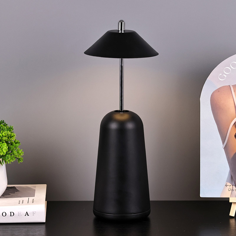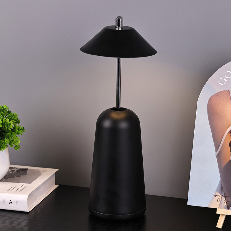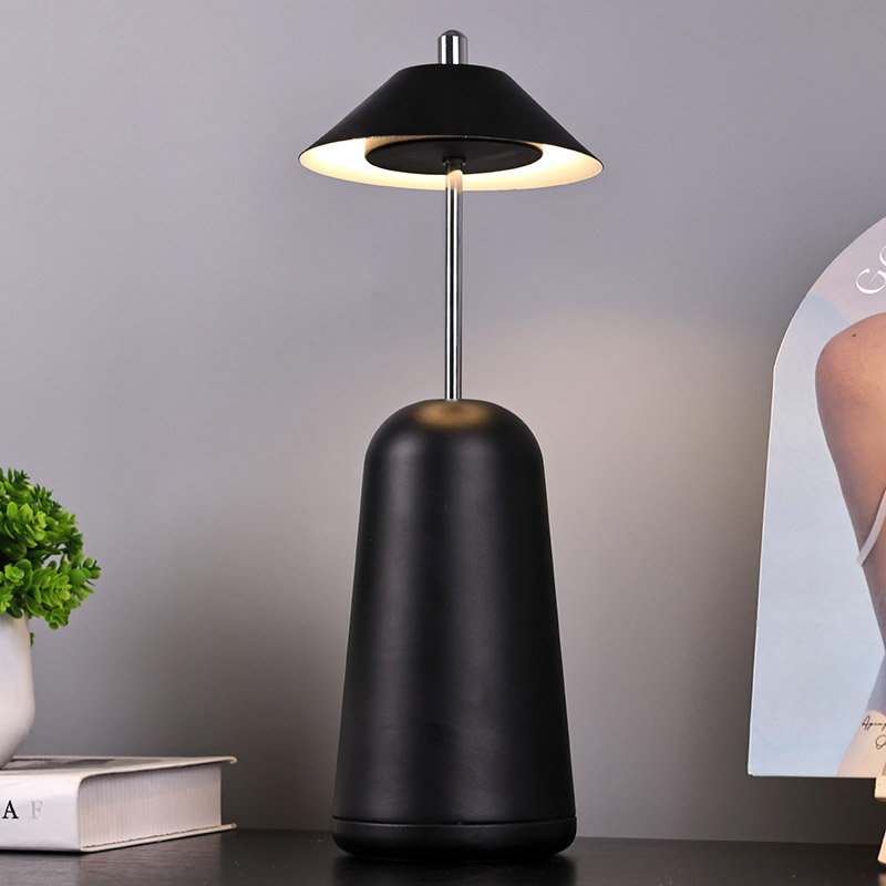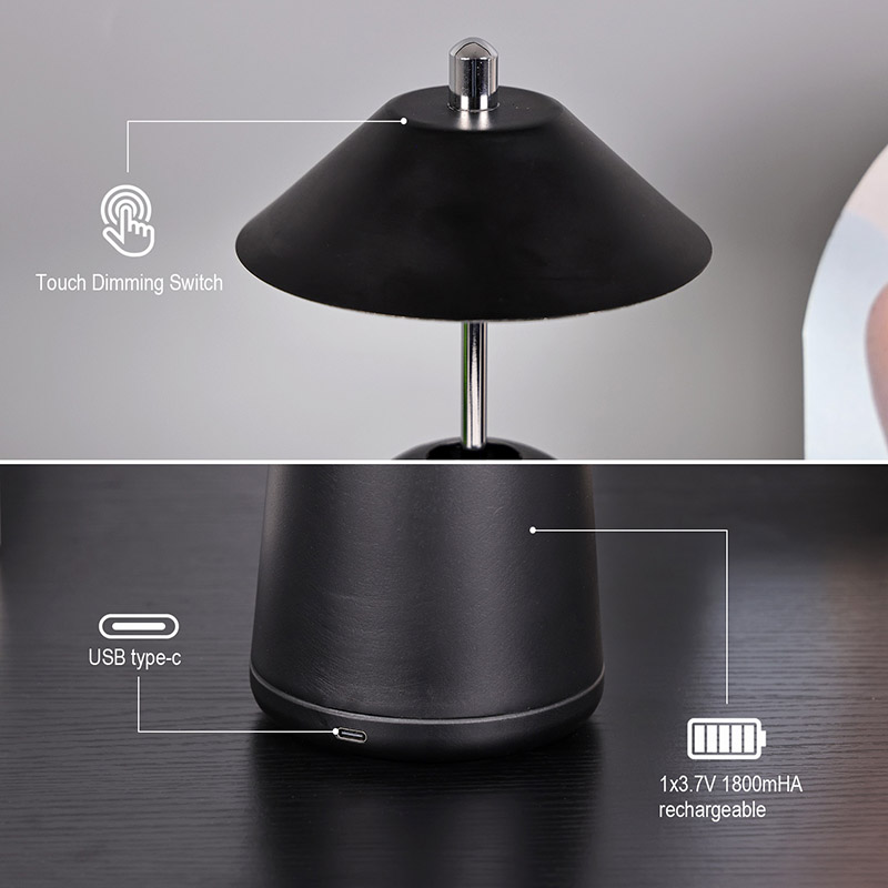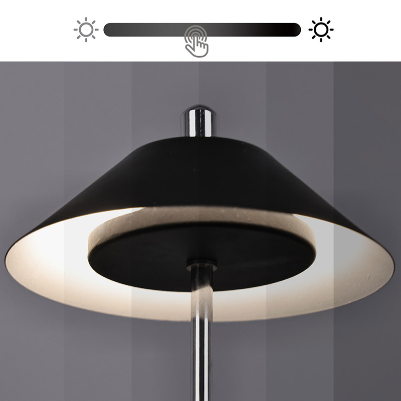 Свет современной светодиодной настольной лампы с регулируемым абажуром встроен в абажур изнутри, имеет теплые цвета и три уровня интенсивности света в диапазоне от 3000K до 6500K. В верхней части абажура расположен сенсорный переключатель, похожий на антенну. Основание состоит из неправильного цилиндрического металла.