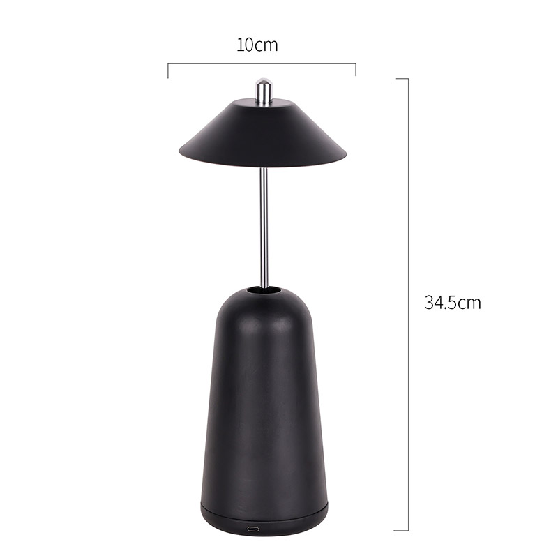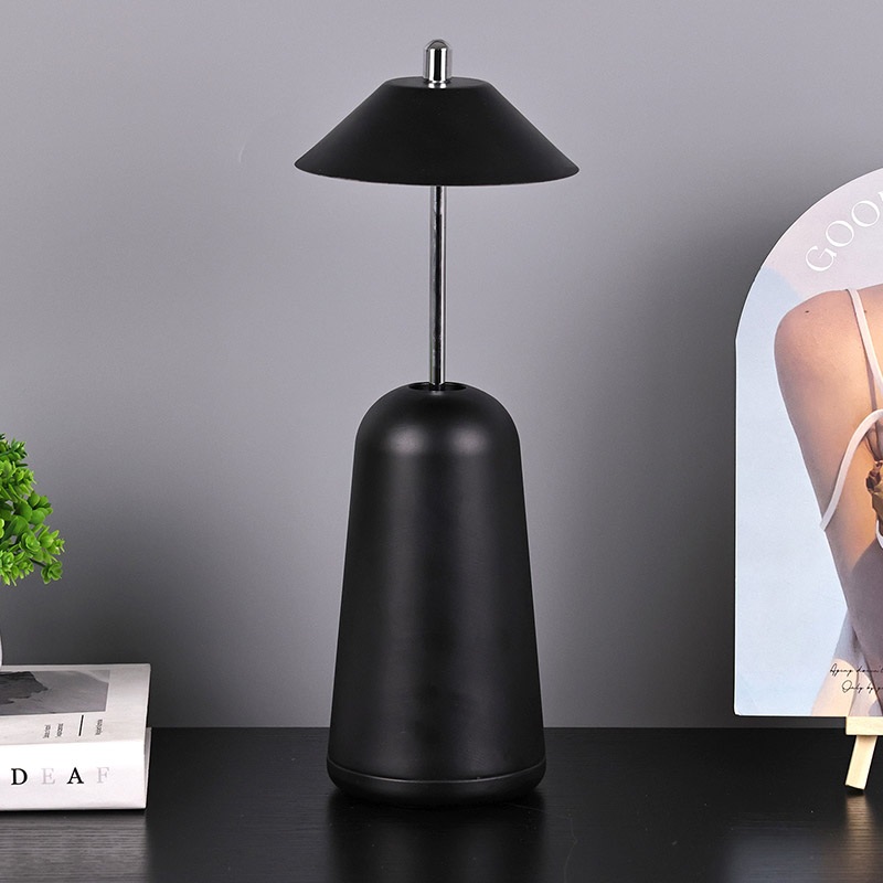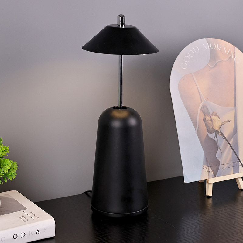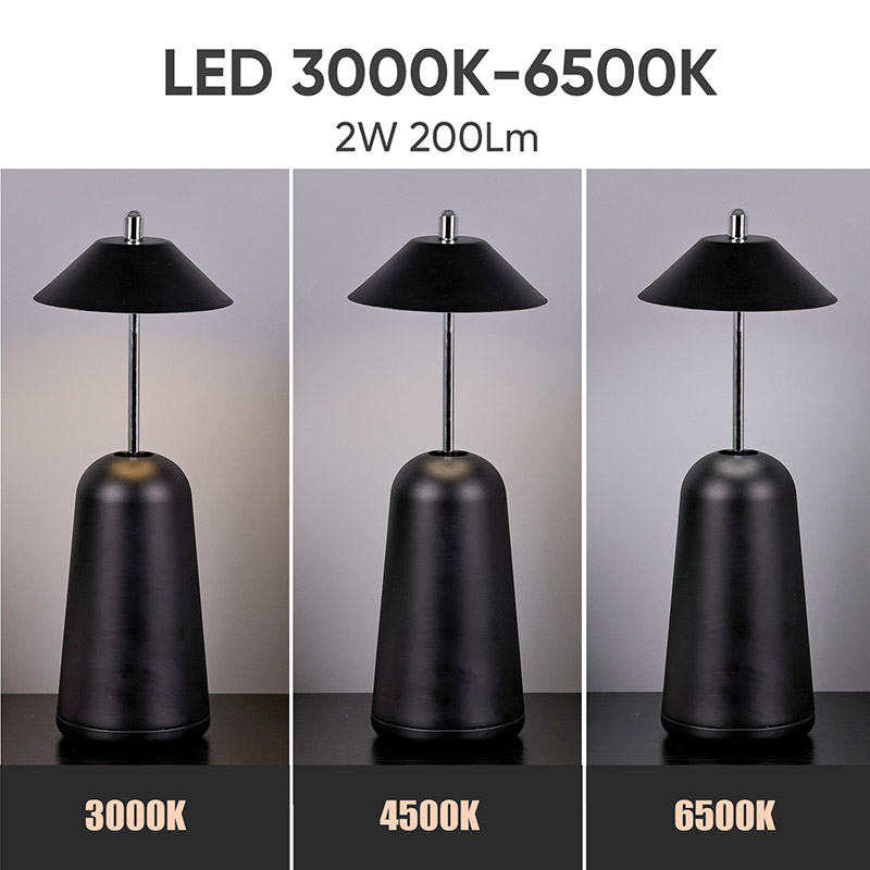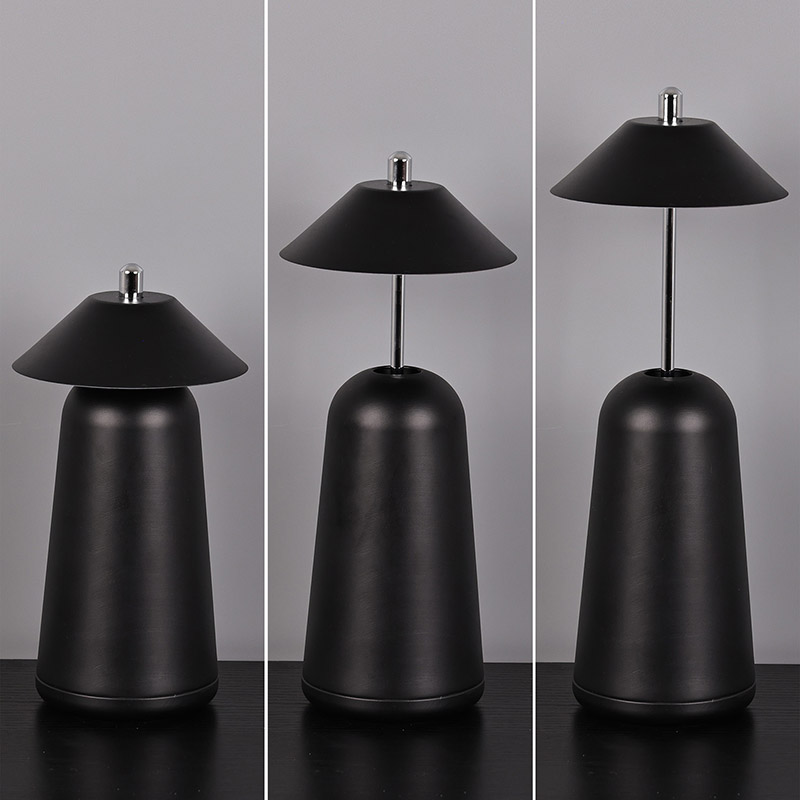 Свет современной светодиодной настольной лампы с регулируемым абажуром встроен в абажур изнутри, имеет теплые цвета и три уровня интенсивности света в диапазоне от 3000K до 6500K. В верхней части абажура расположен сенсорный переключатель, похожий на антенну. Основание состоит из неправильного цилиндрического металла.