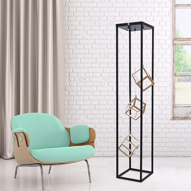 Торшеры современного дизайна, самой большой особенностью продукта является прямоугольная форма рамы, состоящей из металла, с 3 квадратными светодиодными люстрами внутри. Общий дизайн можно использовать как украшение в зале, а вверху есть кнопка для управления интенсивностью света.